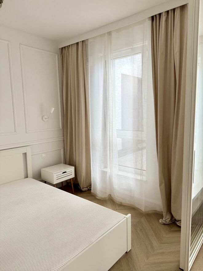 Sypialnia z szafą ubraniową, łóżko z materacem, piękne lampy, kinkiety etc. Sypialnia jest oddzielona od salonu pięknie się prezentującą i robiącą niesamowite wrażenie loftową szklaną ścianą (wszystkie 4 segmenty można przesuwać) z zaciemniającymi zasłonami na szynach ukrytych pod sufitem (można w pełni oddzielić sypialnię od salonu). Dzięki temu całe mieszkanie jest pięknie doświetlone i funkcjonalne a jeśli chcemy - możemy sypialnię kompletnie oddzielić.