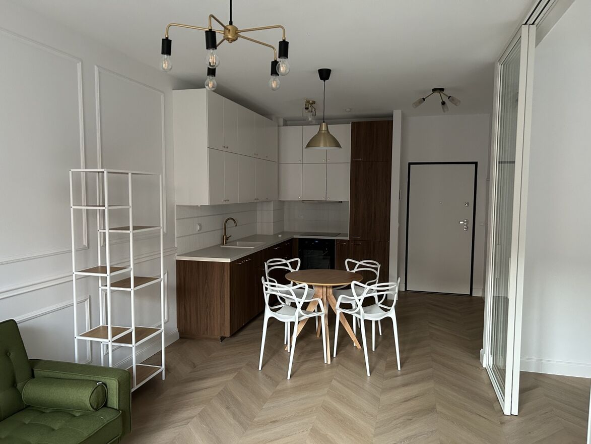 W salonie z aneksem piękna zielona rozkładana sofa, okrągły stół z krzesłami, aneks zabudowany kuchnią IKEA z kompletnym AGD (w tym zmywarka). Na suficie, tak jak w pozostałych pomieszczeniach - gustownie dobrane lampy.