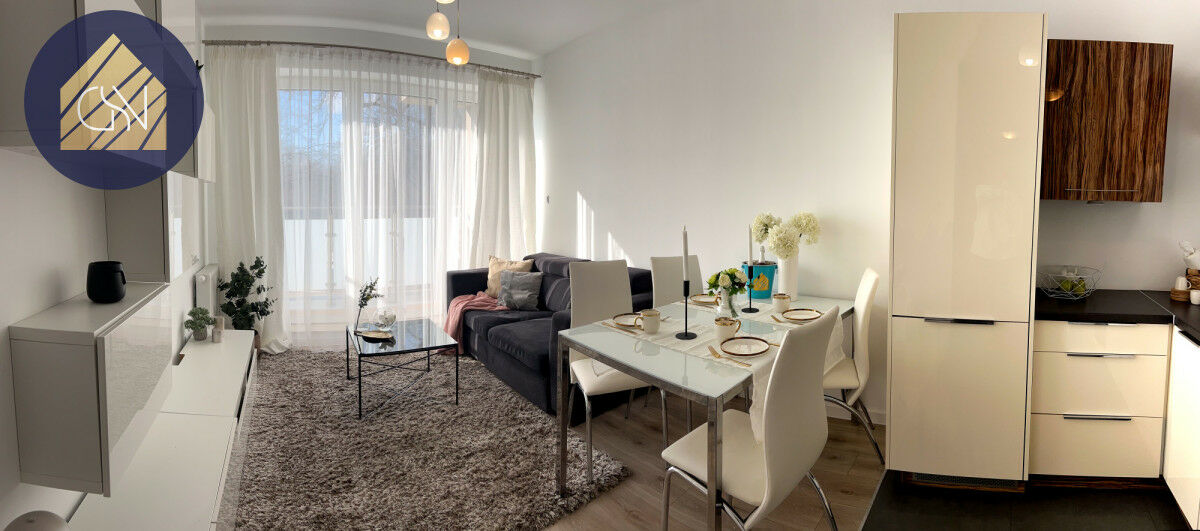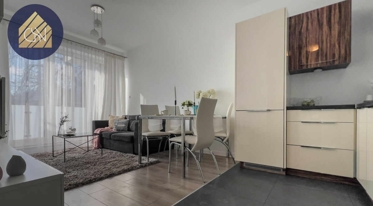 Salon z aneksem kuchennym - wyjście na balkon, idealne na poranną kawę lub wieczorny relaks.