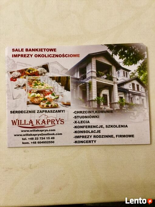 Sale bankietowe "www.willa kaprys.com" to przestronne , pięknie urządzone i wykończone sale w starym dworze z XIX wieku. Dwór położony jest w odległości 3 kilometrów od centrum Grodzisk Mazowieckiego, Domeną naszej usługi jest oferowanie profesjonalnie obsługi w organizowaniu imprez okolicznościowych oraz elastyczne podejście do potrzeb każdego Klienta.Organizujemy: